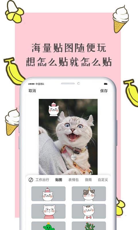 智能水印相机是一款图片水印制作的工具,能够随意添加水印,让图片变得更加有趣和生动,海量贴图随便玩,想怎么贴就怎么贴,出行、贴图、表情图、微商等素材类型,能够任意选择贴纸进行编辑,及时查看到图片设置的变化。