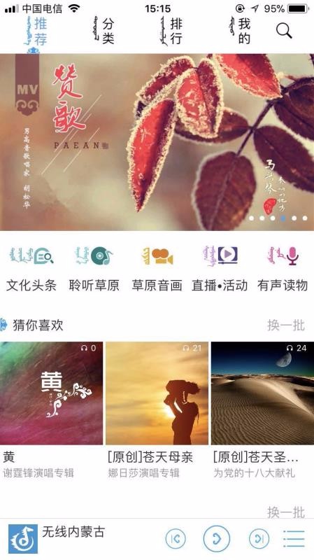 无线内蒙古app是由内蒙古文化音像出版社所开发而出,它主要是为了帮助人们更好的建立草原文化平台,传播草原的文化魅力,在这个应用软件中有着大量的文化资讯、民族音乐、民族影视、有声读物等等资源可以供用户进行使用,非常的优质,并且还有着直播活动,方便用户了解以及参与,通过使用该软件可以让你更加深刻的了解草原文化艺术,感受草原的激情魅力,此app支持免费下载安装使用,可以快速的打开内蒙古名族文化,尊享精彩内蒙世界,吸汗带朋友赶快来试试吧。