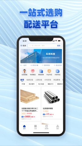 五京建材商城为客户提 供六大类上万种高品质低价格的建筑辅材,并通过数据化、智能 化的仓储管理和物流配送系统,将产品与服务进行统一的信息化 管理,以实现客户下单到完成交付的服务体验。一部手机, 三分钟完成注册、比价、下单、付款、开票等采购全流程服务。