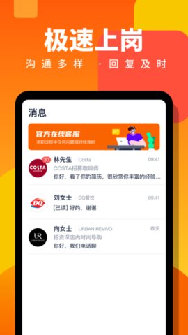 进入消息中心查看招聘方反馈信息,随时回复沟通,跟进求职进度。