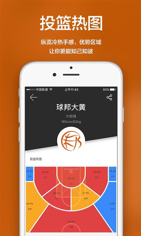 投篮热图,你也可以拥有自己的投篮热图,是的,“球邦”为你呈现自己的投篮热图,冷热手感、优势区域一目了然;