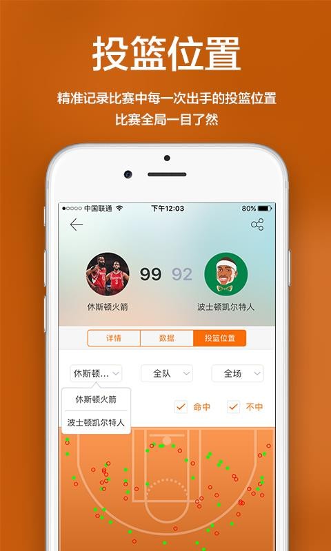 精准记录比赛中的每一次出手位置,比赛全局一目了然;
