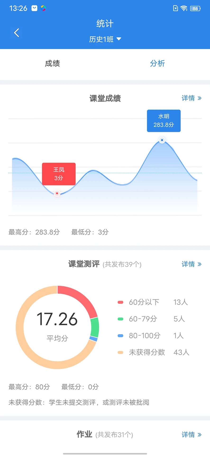 5.支持检测成绩,可以发现更多关于教学测评的统计状况;