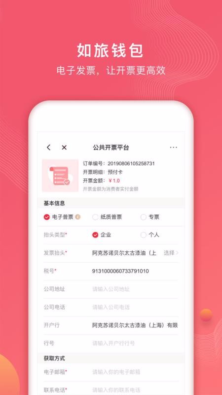 4、如旅钱包,电子发票在线进行申请,让开票更高效;