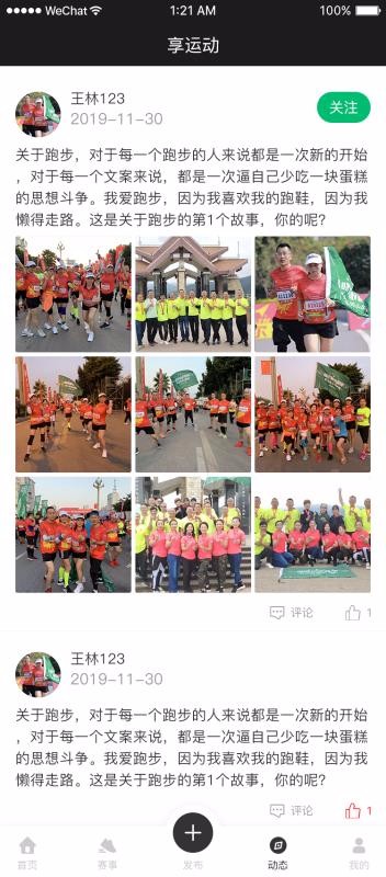 2、打开动态页,浏览用户分享的运动内容,可对内容进行评论、点赞,也能关注发布者。