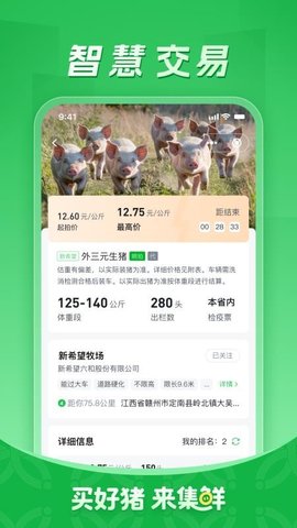 集鲜采猪app精准聚焦畜牧采购用户的核心需求,以“安全、高效、专业”为核心服务理念,通过海量优质猪源整合、实时行情数据同步、专业物流运输保障三大核心优势,为用户打造一站式采猪服务闭环。平台不仅让用户轻松找到优质好猪,更能通过行情把控实现理性采购,同时借助可视化物流跟踪消除运输顾虑。无论是中小型养殖户采购补栏,还是大型屠宰企业批量采购,都能通过该软件提升采购效率、降低采购成本,是畜牧采购领域的得力助手。