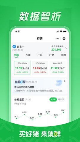 实时行情精准把控:实时更新全国各地区猪价数据,清晰呈现价格涨跌趋势,帮助用户一手掌握市场行情,规避价格风险,实现性价比采购;
