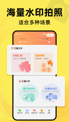 2、集成了拼图汇报、连拍拼图、单张/批量添加水印等核心功能。