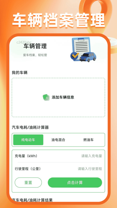 2、在车辆管理页面中可以添加车辆信息,还可以进行汽车电耗/油耗计算器操作;