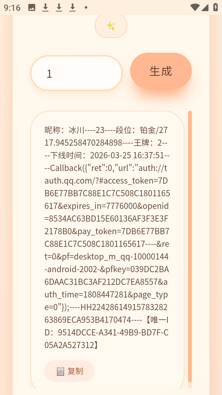 3、然后选择要生成的账号数量后下方就会直接显示账号内容,点击可以一键复制。