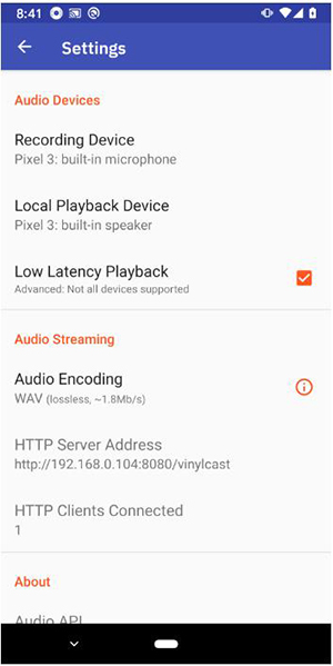 Vinyl Cast面向安卓平台的开源音频串流工具,凭借专业简洁的设计与稳定高效的传输能力,让传统模拟音源轻松迈入无线数字时代。它通过USB 音频接口配合 OTG 连接,可直接接入黑胶唱机、磁带机、调音台等各类模拟音频设备,将细腻温润的模拟信号高质量转换为清晰稳定的数字音频。支持WAV 无损与 AAC 高压缩编码自由切换,兼顾音质追求与带宽适配,满足不同场景下的播放需求。