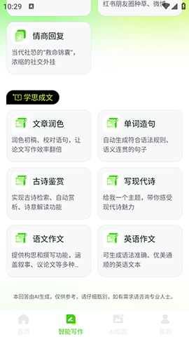 2、在智能写作页面,为大家提供了职场写作、生活创作、学习辅助等不同类型的创作服务。