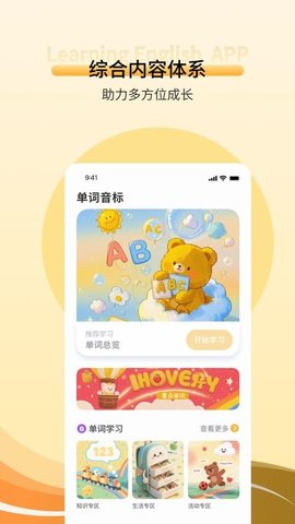 英语英标是一个轻松有趣的英语知识学习平台,主要为儿童阶段的用户带来全面的学习资源,将众多的英语视频课程与英语书籍文章结合学习,可以快速学会拼读英语音标,轻松实现英语文章流畅阅读;还有大量的英语口语知识可以学习,实现英语口语流畅表达,提升用户的英语表达能力。