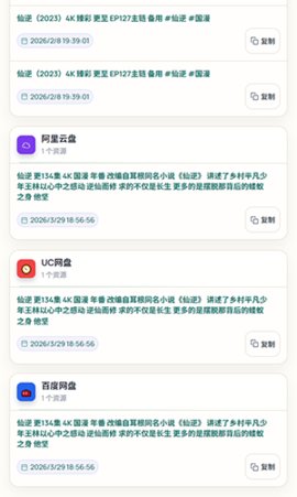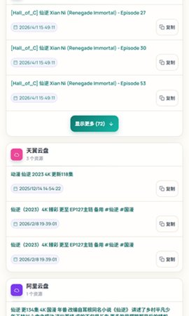 分类型展示:阿里、夸克、百度、115、迅雷等分类清晰,直达链接可复制