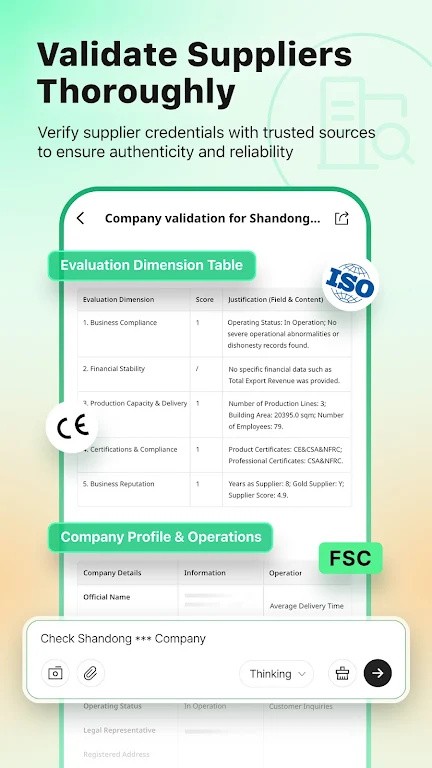 2、自动核查资质、产能、认证、经营状态、出口信誉,输出合规与实力评估报告。