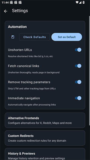 Sidestep深度专注隐私保护的安卓实用工具,专为在意网络痕迹、反感广告追踪与数据收集的用户打造。应用核心功能在于智能识别并自动拦截各类社交媒体外链,系统会实时检测分享链接中的追踪代码、推广参数与行为统计字段,将其彻底剥离清洗,再自动重定向至无广告、无追踪、轻量化的隐私友好前端页面。