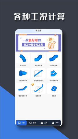 首页聚合“计算”“翻译”“工具”“我的”四大板块,关键功能入口突出(如一键选择管道类型),操作路径清晰直观