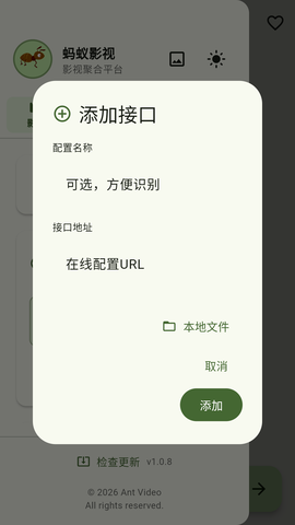 蚂蚁影视APP是一款免费的手机端影视应用,初次打开界面可能显示空白,需用户自行输入在线接口地址完成配置。该应用界面简洁清爽,内置搜索查询功能,方便用户快速查找影片,所有影视资源均可免费观看且无广告干扰,整体使用简单便捷,适合喜欢追剧观影的用户下载体验。