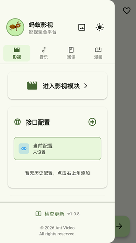 打开蚂蚁影视APP,点击主界面的“配置”按钮(通常为齿轮或箭头图标)。