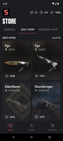 登录Riot账号后,应用可实时同步游戏内每日商店,展示当前可购皮肤与道具列表,并提供详细的物品信息和价格(Valorant Points),让你不错过心仪好物。