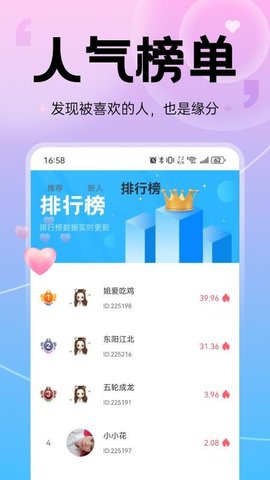 用户需要通过排行榜单查看所有人的排名,了解所有异性的交友热度排名名次;