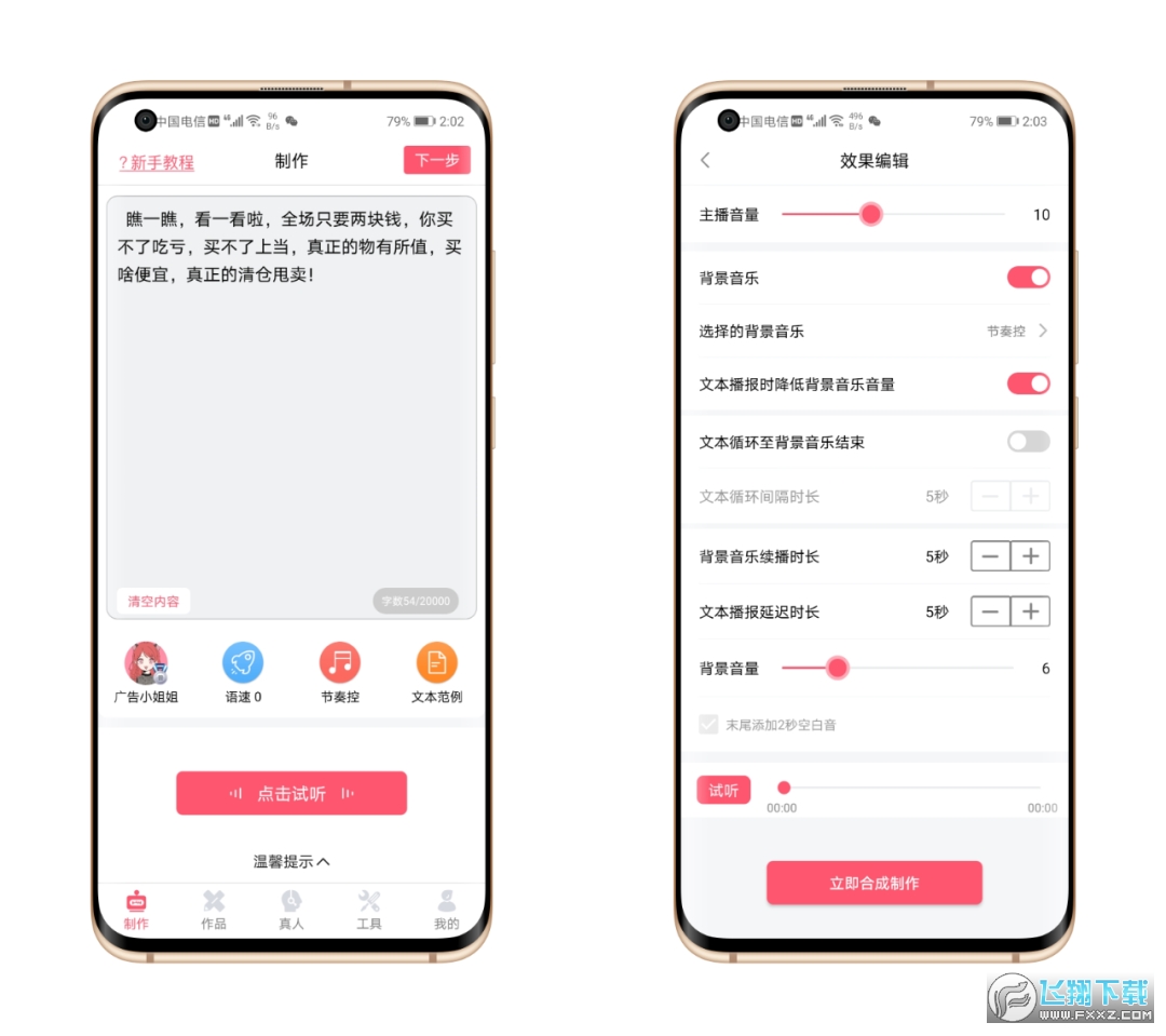 我们制作好一个音频后,点击下一步,就可以合成了,合成之前我们还可以进行最后的调整,比如背景音乐,文本音乐续播时长,文本播报延迟时长,背景音量等等,最后我们点击立即合成制作即可制作完成。