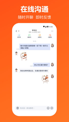 「实时沟通」高效招人,发送消息与求职者在线沟通。