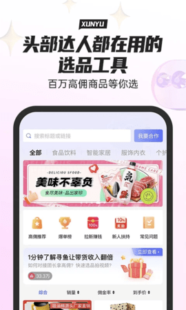 寻鱼优选app是一款深受信赖的选品神器,凭借其无与伦比的议价实力,为您揭示抖音平台上的海量高佣金爆款商品。透过实时更新的爆款榜单,让您轻松把握市场脉搏。安全便捷的资金交易流程全程在抖音体系内完成,现在就加入寻鱼优选,让您的购物之旅更加精彩