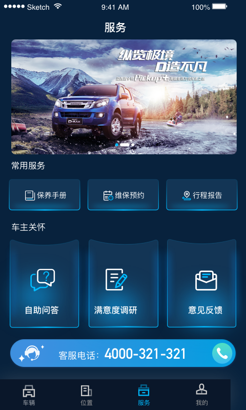 含维保预约、保养手册、行程报告、微客服、自助问答、满意度调研、意见反馈,呼叫客服等功能