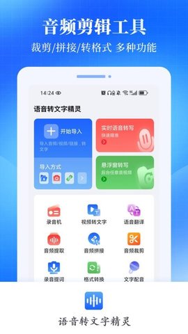 语音转文字精灵app是一款能够将录音、音频、视频一键转换为文字的应用软件,在软件中用户能够获取不同的工具可以轻松提取自己需要的音频内容,强大的技术能够确保用户获取完整、清晰的音频,并将不同的音频内容一键转换为文字,这样可以及时获取里面的信息内容;同时还能够使用不同的音频工具来对音频进行编辑处理,用户能够自定义编辑不同的音频文件,方便用户创作更多专属的音频作品;更有语音翻译、文字转语音等功能,可以让用户轻松翻译更多的内容,并轻松将文本内容变成音频以便用户进行配音等!