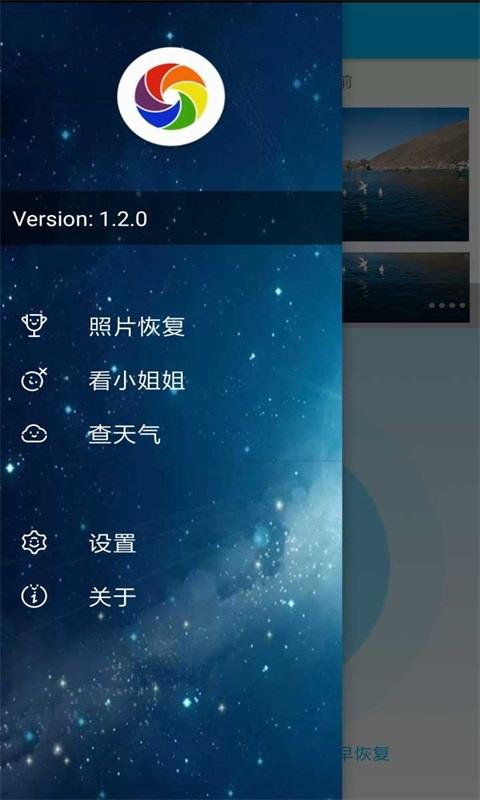 4、在主页点击左上角的三条杠,可以进行照片恢复、看小姐姐和查天气等操作。