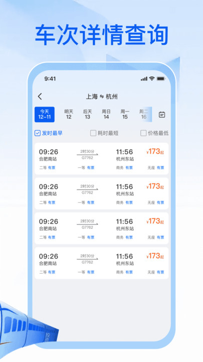 2、用户可根据“出发时间最早”“行程耗时最短”等条件灵活筛选车次,满足多样化的出行需求。