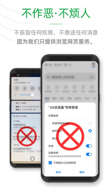 1、默认开启隐私模式,浏览过程中不会在本地留下任何缓存、历史记录或Cookie。