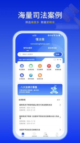 懂法猫app是一款可以进行法律查询的软件,软件收集大量的法律条例和案例,用户可以通过软件查询自己需要的法律条例,里面拥有不同领域的法律条例,能够让用户获取更加全面的法律法规;并且不同的司法案例,也可以让用户获取更多法律数据来进行参考,在打官司和进行工作过程中都可以为用户提供更多的帮助;在这里不管什么行业的用户群体,都可以使用软件查询需要的法律相关内容;此外也可以通过软件将自己需要的案例下载下来,这样可以不同软件中进行下载出来的文档内容,帮助更多的获取详细的法律资料!