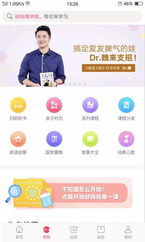 2、在学院页面可以进行育儿知识的学习,还可以查看精品课程。