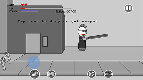 进入游戏后,左侧屏幕移动蓝色圆圈控制角色移动,左上角显示当前生命值、hp经验、power力气(需时间恢复),底部有快捷按键,如“Drop”可释放机械手中拾取的武器。