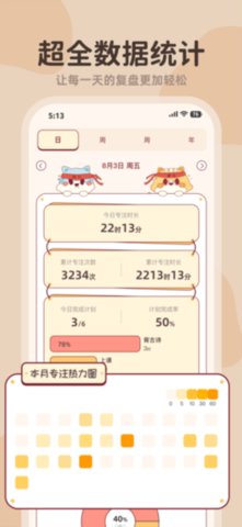 柱状图、热力图各色数据展示,任务完成率清晰可见,让您在回顾过去的过程中规划未来,每分每秒都是您努力的证明,让我们为您记录这这些奋斗的时光。
