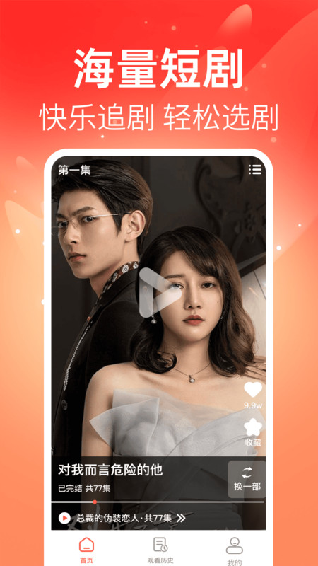 1、首页直接播放各类热门短剧,配备点赞收藏标记功能与换剧按钮,轻松切换心仪内容。