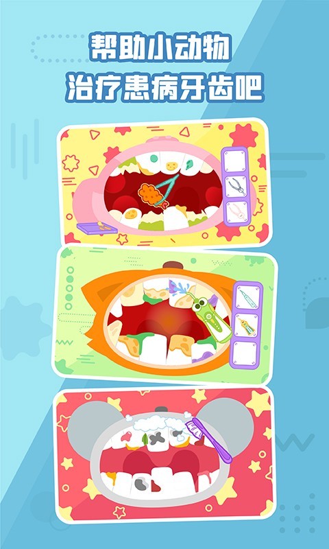 9.带有卡通可爱图片,可以模拟医院拔牙,牙齿清洁,填充和治疗的场景;