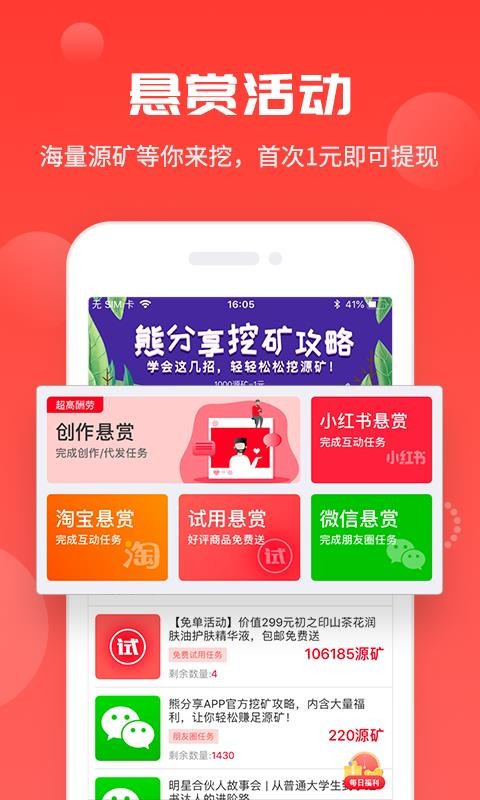 熊分享是一款共享经济平台,能够增加宣传力度,提升品牌的影响力,这里拥有大品牌内购的服务,及时清库存,买到就是赚到,立即进入内购专场,查看到专场推荐的精品商品,极速获取到优质商品;每日秒杀活动享不停,淘宝商品自买更省钱,还能通过分享赚钱。