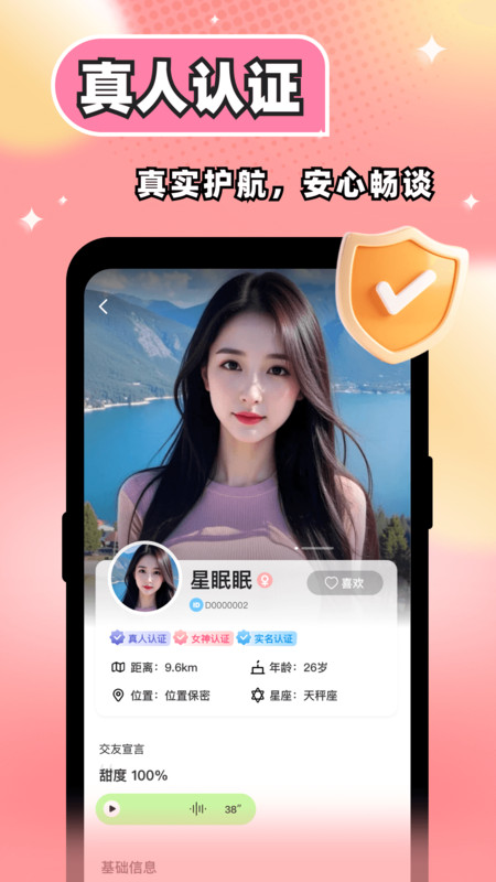 1、强调真实交友,视频面对面交流,你看到的、听到的都是对方最真实的样子,放心地去了解彼此。