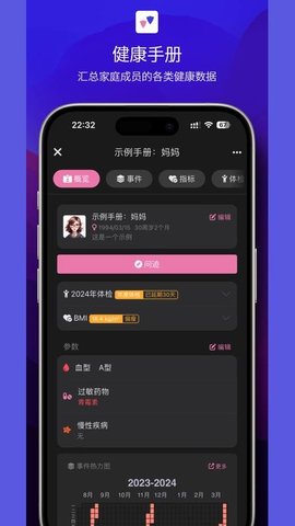 能给爸妈、孩子等每个家庭成员创建专属健康手册,记录姓名、血型、过敏史、慢性病等基础信息,全家健康信息集中管理,一目了然。