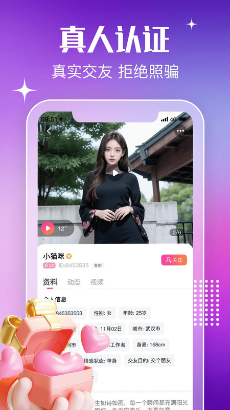 1、真人认证超严格,确保交友对象真实可靠,避免遇到虚假身份的人,让交友过程更安心。
