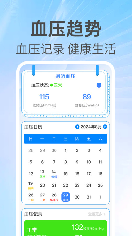 1、在app首页带来了血压日历和记录功能,一键使用。
