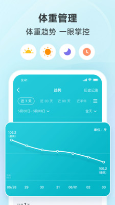 3、提供体重记录、个性化体重目标计划、体重趋势变化及分析等多样化的功能,知道自己的变化;