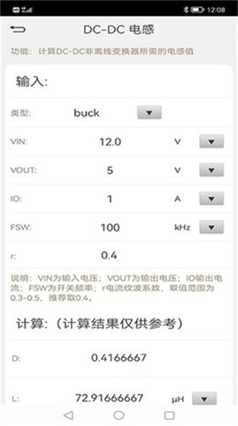4、进入DC-DC电感计算模块后,填写输入电压、输出电压、输出电流、开关频率等参数,系统会自动计算所需电感值,方便用户快速应用。