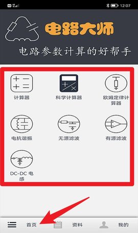 3、登录成功后,在首页可以看到各种电路计算工具,包括科学计算器、欧姆定律计算器、电抗谐振、滤波器等功能模块,用户可按需选择。