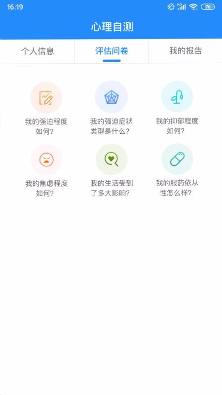 2、切换到评估问卷页,选择强迫程度、抑郁程度等测评项目,参与对应的心理自测。