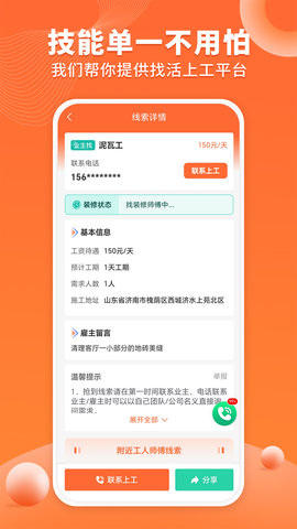 工长工人随时接单,信息透明、所见无虚,一键接单/找活!