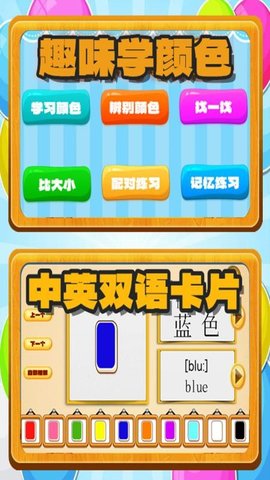 软件为宝宝提供了颜色的双语学习,宝宝在学习中能够学习到汉语颜色发音和英语颜色发音。